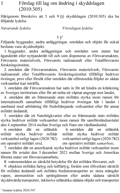 Den 25 april 2025 remitterade Försvarsdepartementet promemorian En tydlig beslutsordning för deltagande i Natos samlade verksamhet för avskräckning och försvar (Ds 2025:11). I propositionen behandlar regeringen förutom promemorians lagförslag också följdändringar i skyddslagen.