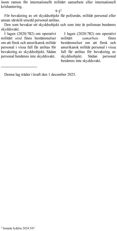 Den 15 oktober 2020 trädde lagen om operativt militärt stöd (2020:782) mellan Sverige och Finland i kraft. Enligt lagen får regeringen fatta vissa beslut om att lämna respektive ta emot operativt militärt stöd inom ramen för försvarssamarbetet med Finland. I förarbetena framhålls att det svensk-finska försvarssamarbetet har en särställning bl.a. eftersom det innefattar operationsplanering och förberedelser för ett gemensamt agerande, vilket förutsätter att beslut om att ta emot och lämna operativt militärt stöd, bl.a. i form av väpnade styrkor, kan fattas med mycket kort varsel. Med hänsyn till tidsåtgången för riksdagens ordinarie beslutsprocess och då det rör sig om ett långsiktigt samarbete som kräver kontinuerliga åtaganden gjordes bedömningen att det fanns anledning att bemyndiga regeringen att fatta nödvändiga beslut (prop. 2019/20:110, bet.2019/20:UFöU5, rskr. 2020/21:3).