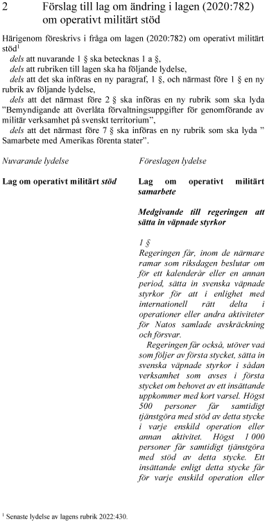 I propositionen lämnas förslag som syftar till att skapa bättre förutsättningar för Sverige att delta i det operativa militära samarbetet inom Nato. Sverige kommer kontinuerligt att delta i Natos samlade verksamhet för avskräckning och försvar. Regeringen föreslår att det i lag införs en reglering om hur beslut ska fattas för att sätta in svenska väpnade styrkor i sådan verksamhet. Enligt förslagen ska ett deltagande som huvudregel även i fortsättningen kräva beslut av riksdagen. Ett sådant beslut kan avse verksamhet under ett kalenderår eller annan period, men även deltagande i en särskild operation eller aktivitet. Därutöver föreslås att regeringen, även utan ett föregående beslut av riksdagen, under en begränsad tid ska få sätta in en svensk väpnad styrka med ett begränsat antal personer om behovet av ett svenskt deltagande uppkommer med kort varsel eller om ett dröjsmål skulle kunna leda till avsevärda men för angelägna svenska intressen. Det föreslås att regleringen införs i lagen om operativt militärt stöd, vilken föreslås byta namn till lagen om operativt militärt samarbete. Till följd av att lagens namn ändras föreslås också ändringar i skyddslagen.