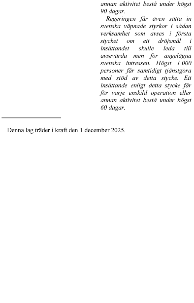 Riksdagen har beslutat om två propositioner gällande Sveriges bidrag till Natos verksamhet för avskräckning och försvar. Båda besluten fattades genom tillämpning av möjligheten i 15 kap. 16 § andra stycket 2 regeringsformen om riksdagens medgivande att sända väpnad styrka i ett särskilt fall. Den 12 december 2024 beslutade således riksdagen att medge att regeringen ställer en svensk väpnad styrka bestående av markförband, specialförband och amfibieförband om högst 1 200 personer, högst sex örlogsfartyg med tillhörande personal och högst 24 stridsflygplan med tillhörande personal till förfogande t.o.m. den 31 december 2025 för att bidra till Natos samlade avskräckning och försvar av det nordatlantiska området (prop. 2024/25:22, bet. 2024/25:UFöU2, rskr. 2024/25:104). Vidare medgav riksdagen den 20 mars 2025 att regeringen ställde en svensk väpnad styrka bestående av högst åtta stridsflygplan med tillhörande personal till förfogande fr.o.m. den 1 maj 2025 t.o.m. den 31 augusti 2025 för att delta i Natos luftförsvarsoperation i Polen med uppgift att skydda och upprätthålla säkerheten för den logistiknod som används för det militära och civila stödet till Ukraina (prop. 2024/25:113, bet. 2024/25:UFöU3, rskr. 2024/25:166).