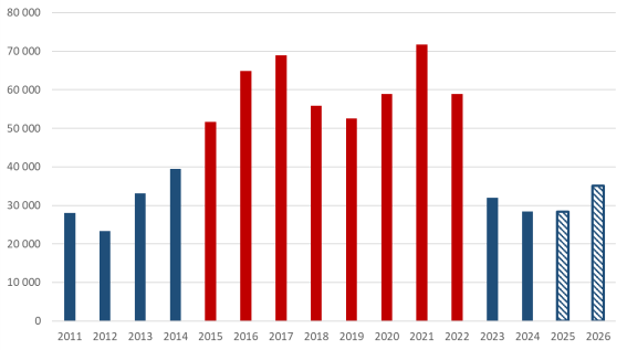 (Antalet påbörjade bostäder, prognos för 2025 & 2026)