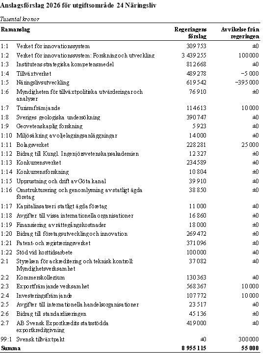 - Riksdagen anvisar anslagen för 2026 inom utgiftsområde 24 Näringsliv enligt förslaget i tabell 1 i motionen.